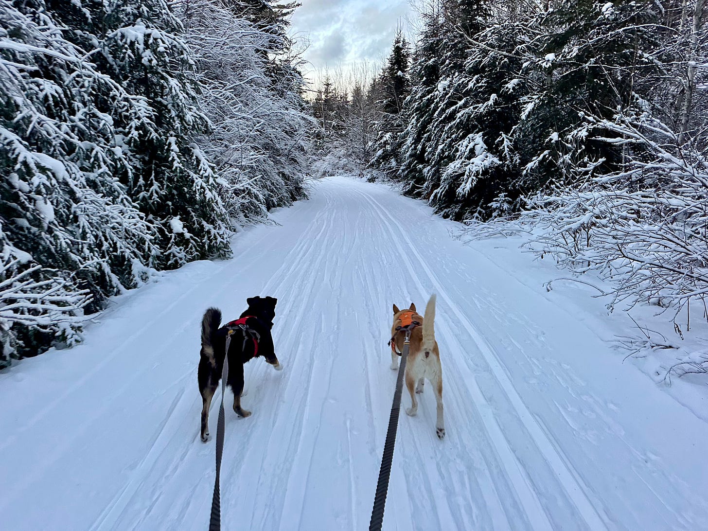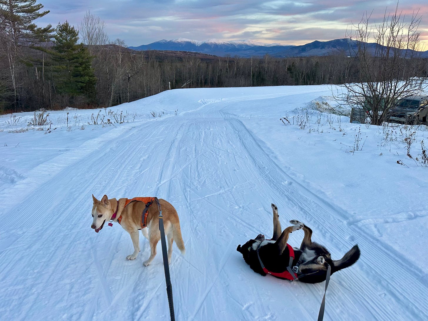 Skijoring is a comical sport for the dogs and me. I wear a harness on my waist that loops around my legs, and the dogs attach to me on long bungee leashes that connect their harnesses to mine through a flat red strap around my waist that doubles as an emergency release. But before I can attach them, I have to lay out my skis and poles, shoulder my Camelbak, and start the GPS tracker on my phone. Then I sling open the sliding door of our Astro van and the dogs burst out, sniffing every pile of snow that their bungees will stretch to as I try to untangle their leashes and connect them to me.
